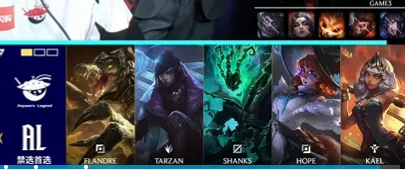 AL选用:Flandre鳄鱼,Tarzan奇亚娜,Shanks阿萝拉,Hope厄斐琉斯,Kael锤石