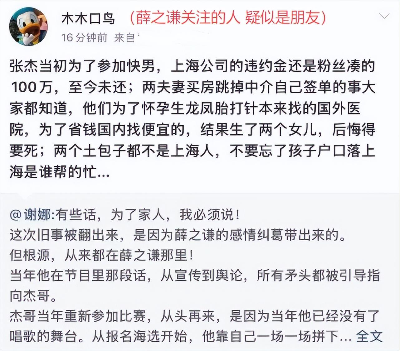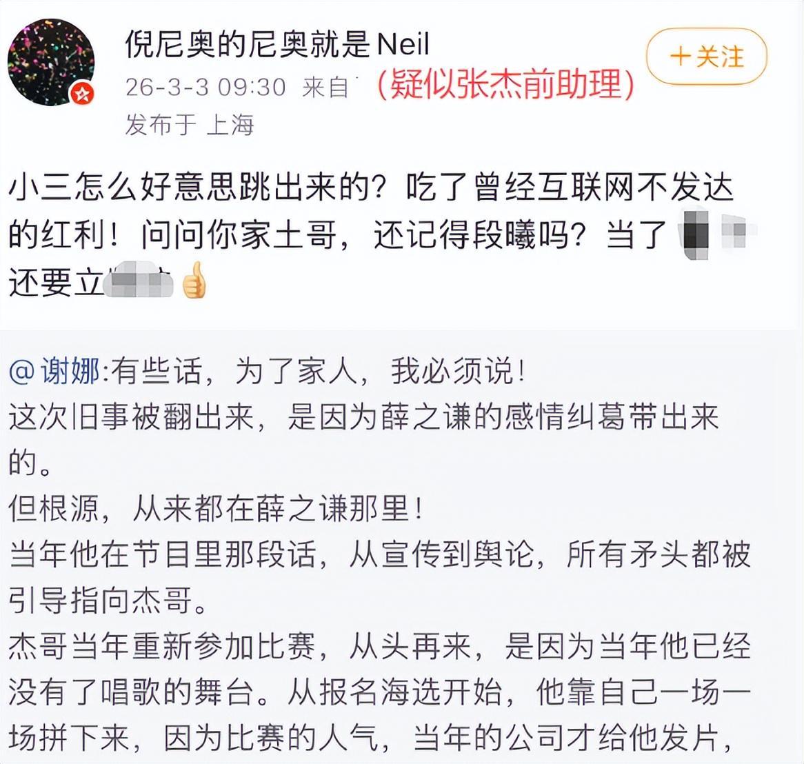 疑似张杰前助理,在谢娜发文控诉薛之谦后,直接转发指控谢娜为“小三”。